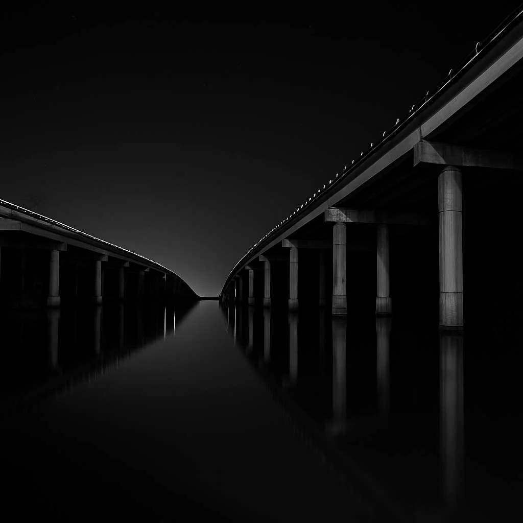Original Image: A 2x3 format, high-contrast black-and-white photo of two parallel highway bridges converging toward the horizon, their reflections mirrored in still water.