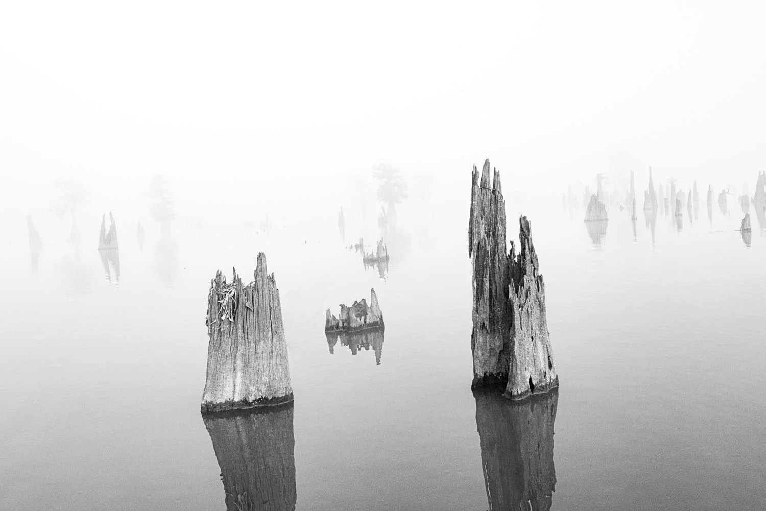 This image was made with a 35mm lens, something rarely usable in open swamp scenes because of background clutter. But the fog rendered everything distant invisible, allowing me to use a wide focal length without distractions. There was color in the foreground stumps—rich browns and silvery grays—but I chose to process this as a black-and-white image to emphasize form, texture, and the eerie stillness of the moment.